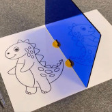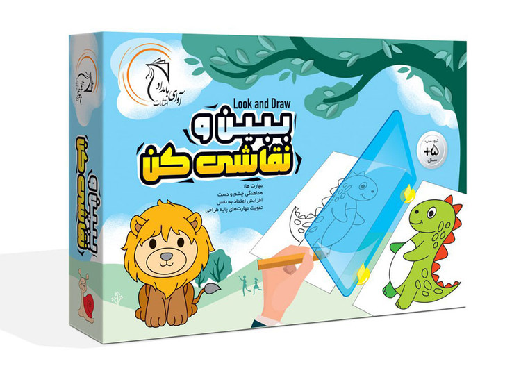 هدف از بازی ببین و نقاشی کن آشنایی کودکان با خطوط محیطی در طراحی و نقاشی است. این وسیله شامل یک صفحهی طلقی پایهدار، یک بسته مدادشمعی ۱۲ رنگ، یک مداد و تعدادی طرح رنگی و بیرنگ است. توصیه میشود که ابتدا از طرحهای بدون رنگ استفاده شود. طرحی را که قرار است ترسیم شود در یک طرف و کاغذ سفید را در سمت دیگر طلق قرار دهید. سپس از کودک بخواهید با نگاه کردن به انعکاس تصویر بر روی طلق، تصویر را در سوی دیگر، روی کاغذ سفید بکشد. این کار را علاوه بر طرحهای درون جعبه میتوان با هر تصویر دیگر یا حتی اشیاء انجام داد. بسیاری از کودکان فقط به دلیل نداشتن درک درستی از خطوط محیطی طرف نقاشی نمیروند؛ این وسیله میتواند در تقویت اعتماد به نفس آنان بسیار مؤثر باشد.