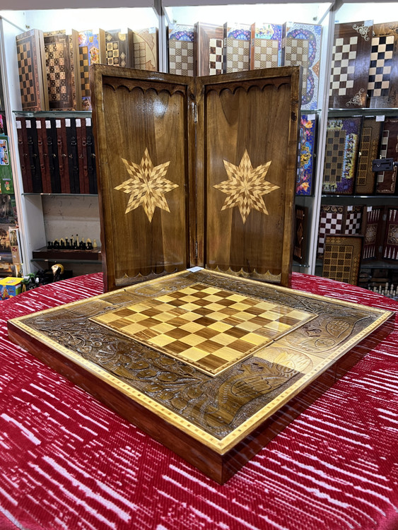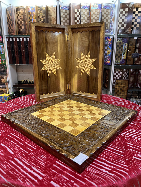 Urmia backgammon and chess board, walnut wood, hand-carved and mosaic, throat design