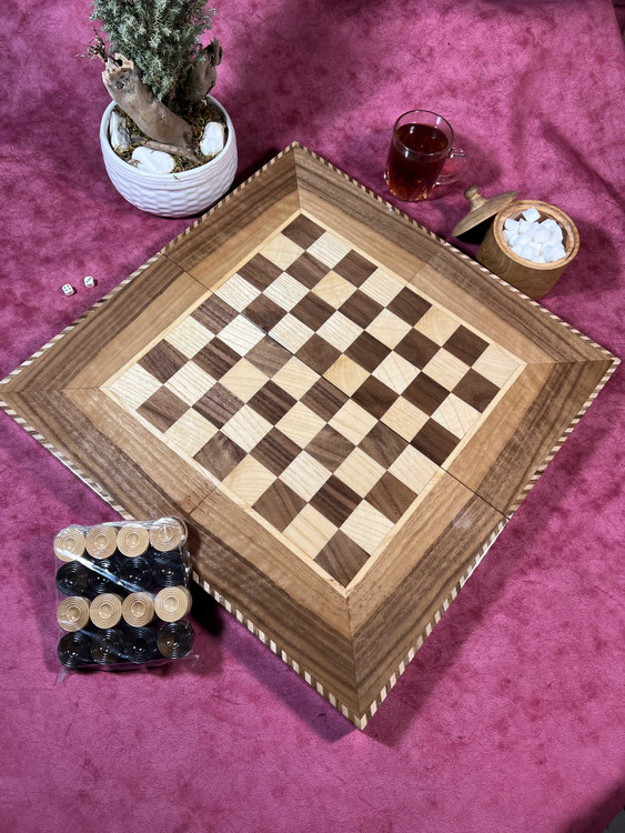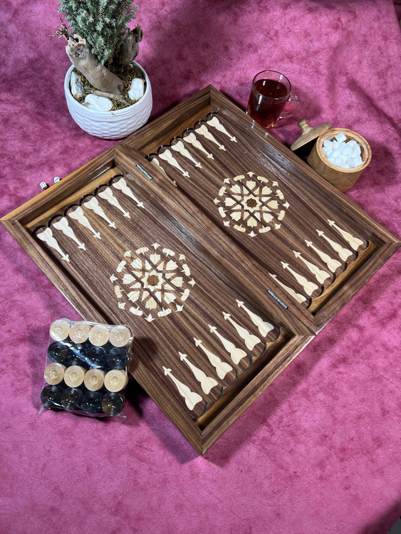 تخته نرد تمام گردو داخل کار معرق پر کار انجام شده و همینطور حاشیه هایه تخته نرد و صفحه شطرنج آن، این تخته نرد دولا یه پلی استر ایستاده خورده که در هر شرایط ابو هوایی دوام دارد✅