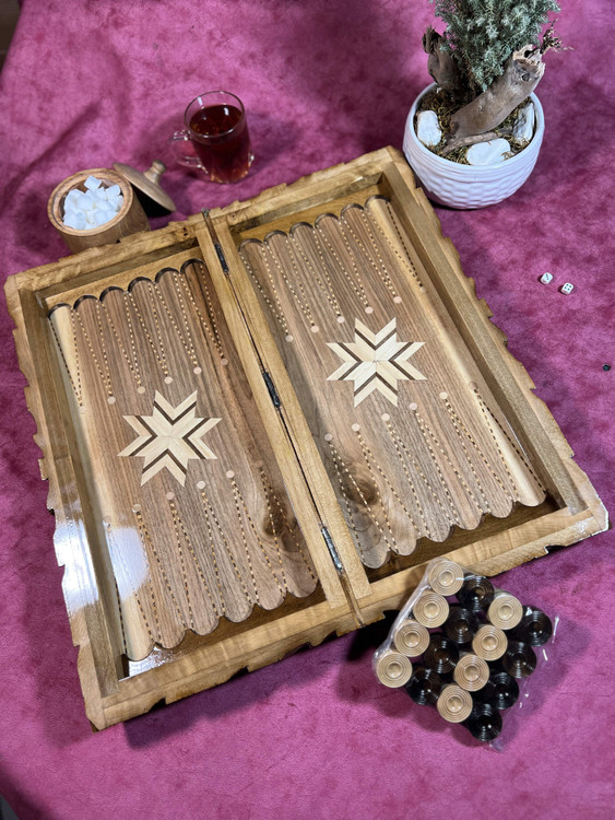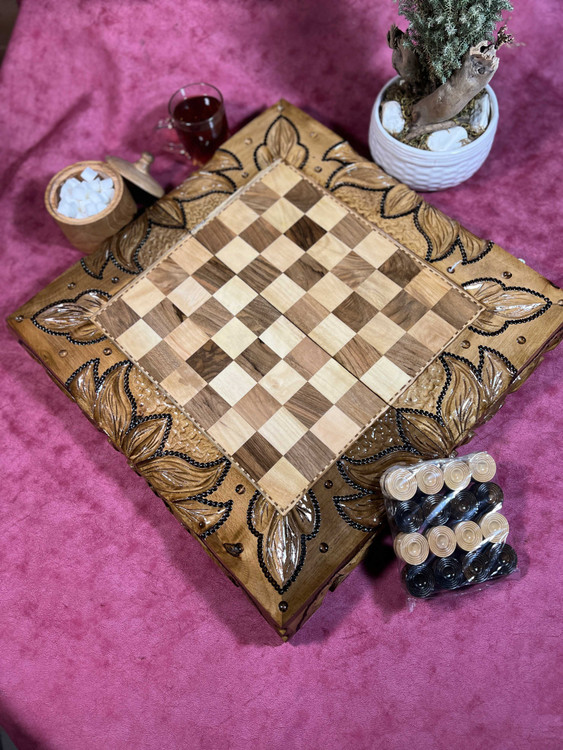 تخته نرد تمام گردو دور کار و حاشیه هایش بالایی کار تماما منبت دست انجام شده صفحه شطرنج تخته و داخل تخته نرد معرق پر کار دست شده این تخته نرد سه لولا دارد و نصبت به تخته نرد هایه معمولی عمیق تر میباشد و همینطور سه لایه پلی استر ایستاده خورده که در هر نوع شرایط ابو هوایی دوام کامل دارد
