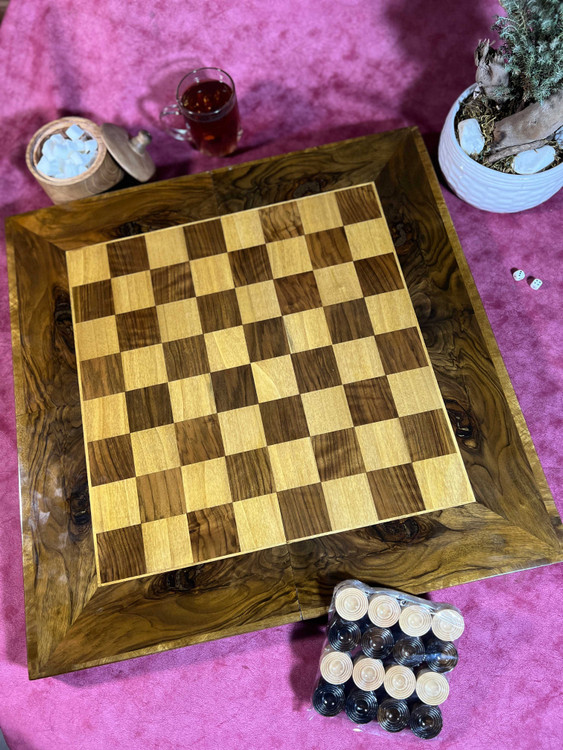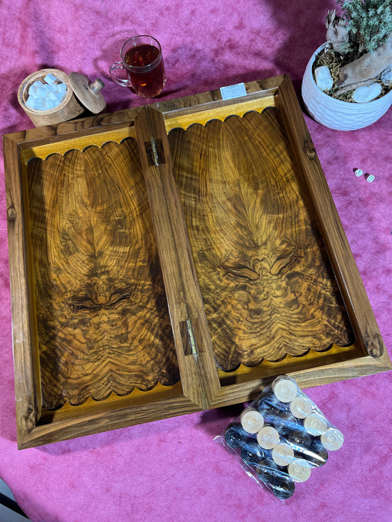 تخته نرد ۵۵سانتی ریشه گردو یه کار فوق با کیفیت و فوق حرفه ای دوستان این تخته نرد رنگش لاک الکل هستش و صفحه شطرنجش هم معرق دست هستش امیدوارم که از دیدن و داشتن همچین اثری لذت ببرید 🌹