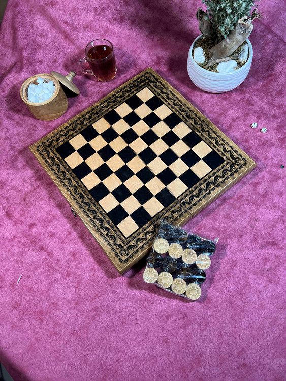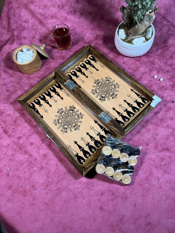 این تخته نرد دورش تماما چوب ملچ هستش روکش چوب راش شده و داخل و بیرون کار چاپ رویه چوب هستش قفل هم دارد.