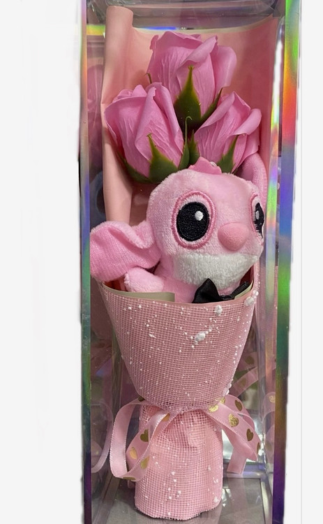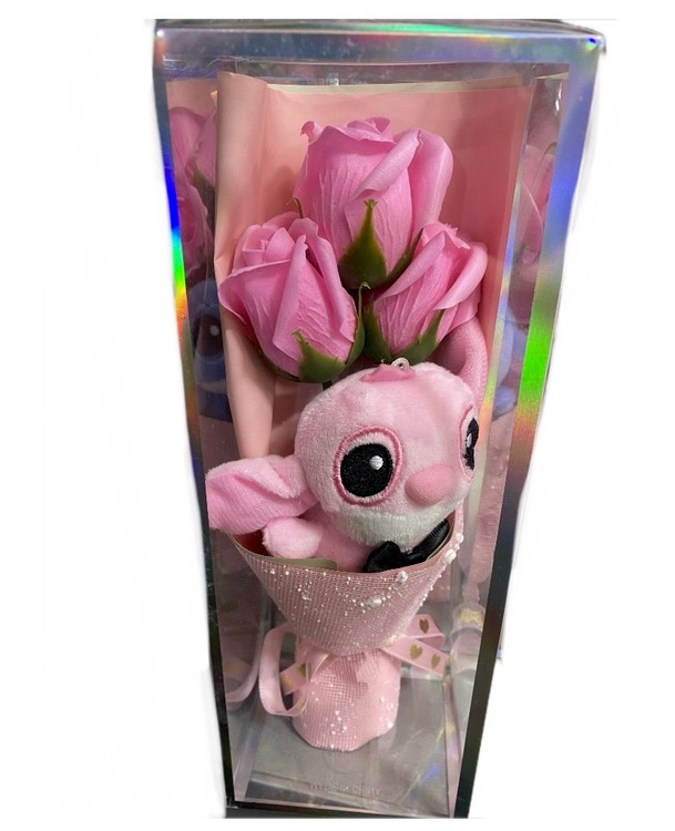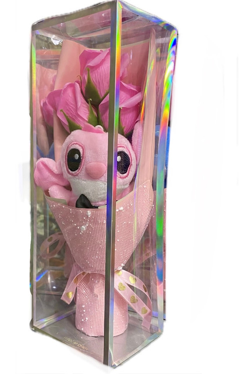 داخل باکس گل رز مصنوعی همراه با عروسک کوچیک استیچ با یه بسته بندی زیبا مناسب برای هدیه دادن