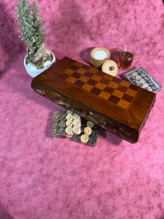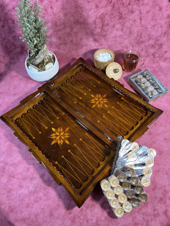 تخته نرد تمام گردو داخل و بیرون کار معرق دست هستش سه لایه پلی استر ایستاده خورده و یک لایه لاک و دور کار تماما معرق دست هستش سه لولا خورده و از تخته نرد هایه معمولی عمیق تر هستش