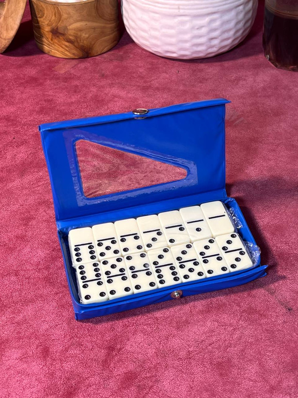 دومینو از جنس سرامیک روی هر کدام از دومینو ها خال فلزی دارد و با بسته ی چرمی در رنگ های مختلف تقدیمتون میشه